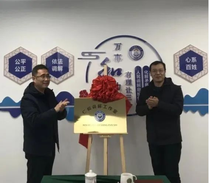 焦自軍院長(zhǎng)與日照城投集團(tuán)副總經(jīng)理費(fèi)聿輝為“仁和調(diào)解工作室”揭牌。