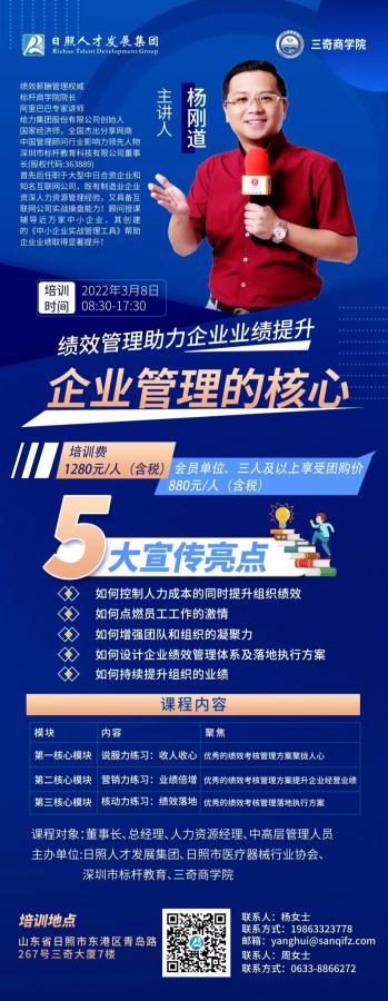 日照人才發(fā)展集團(tuán)有限公司與日照市醫(yī)療器械行業(yè)協(xié)會、深圳市標(biāo)桿教育、三奇商學(xué)院將于2022年3月8日共同組織舉辦《企業(yè)管理的核心》績效管理專題培訓(xùn)。現(xiàn)已開班報名中,期待您的參與!