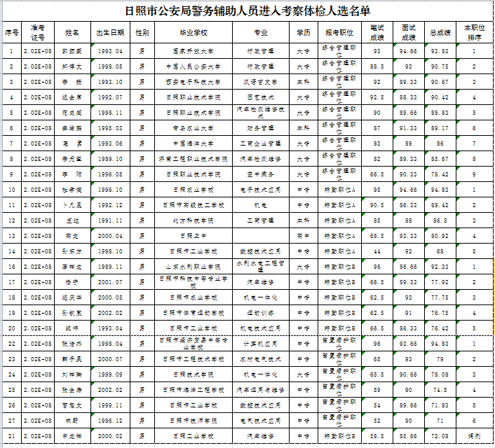 2020年日照市公安局警務輔助人員招聘進入考察體檢范圍人員。