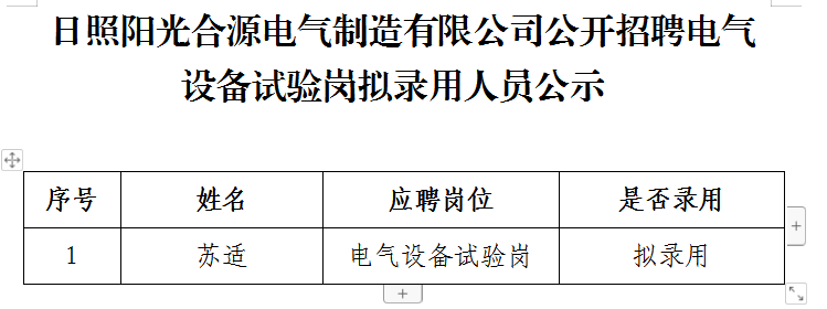 日照陽光合源電氣制造有限公司公開招聘電氣設(shè)備試驗崗擬錄用人員公示
