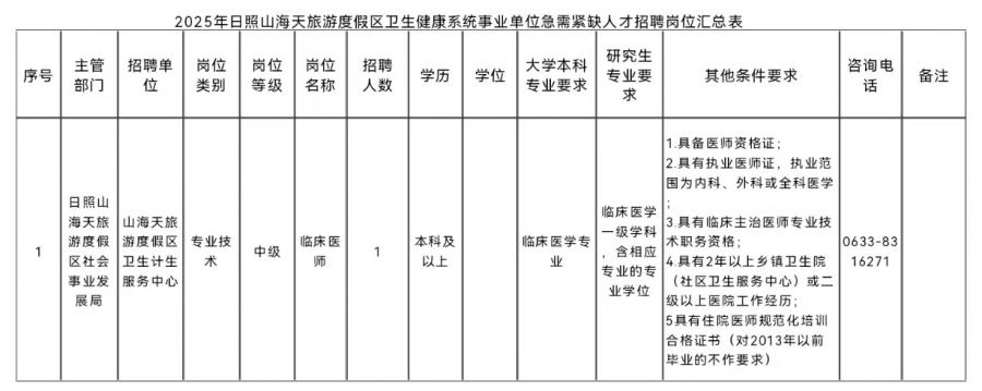 根據(jù)事業(yè)單位公開招聘有關(guān)規(guī)定,結(jié)合日照山海天旅游度假區(qū)衛(wèi)生健康系統(tǒng)事業(yè)單位崗位空缺情況和工作需要,現(xiàn)將2025年度日照山海天旅游度假區(qū)衛(wèi)生健康系統(tǒng)事業(yè)單位公開招聘急需緊缺人才有關(guān)事項公告如下: